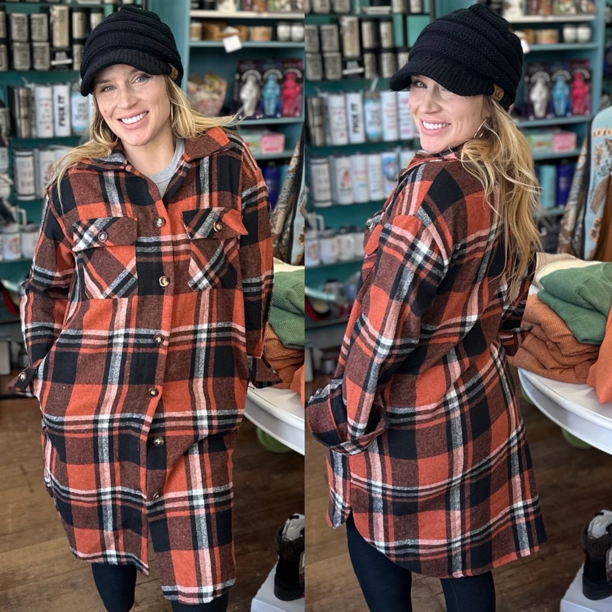 Nice and Long! Rust, back & cream plaid long flannel shacket. Button closure Two side pockets 100% Polyester.