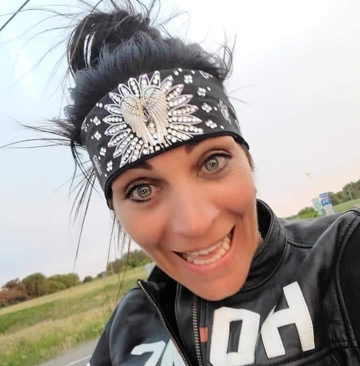 Don't want to tie the back anymore, then simply choose our NO KNOT NO TIE option when adding this sass to your cart. American made bandana loaded with both clear and AB Swarovski crystals and dazzling rhinestones! You will dazzle the motorcycle roads in this beauty! Quality! #bandana #angelwing #motorcycle #blingbandana #gobrazen