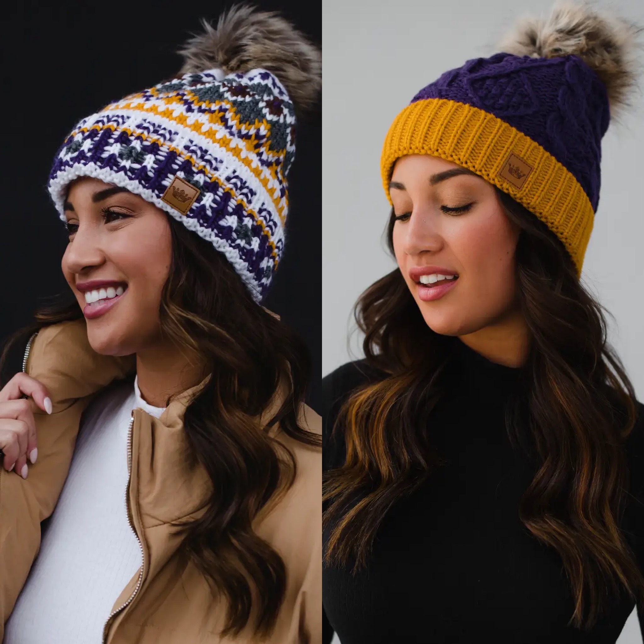 SKOL! Vikings football colors never looked so good! White. purple, gold, gray & brown patterned knit hat Natural faux fur pom accent Fleece lined 100% Acrylic
