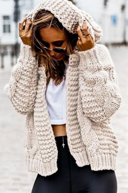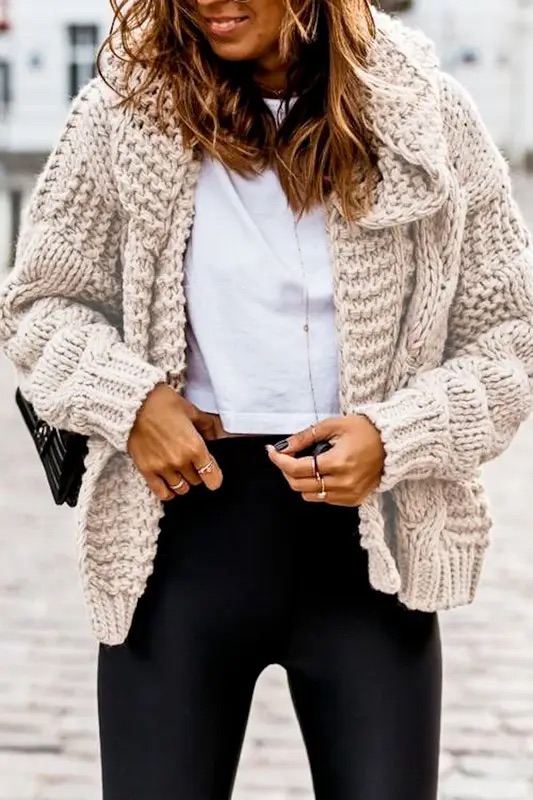 Open front cable knitted sweater jacket -45% cotton, 55% polyester -cable tie knitted -open front -loose fit hoodie