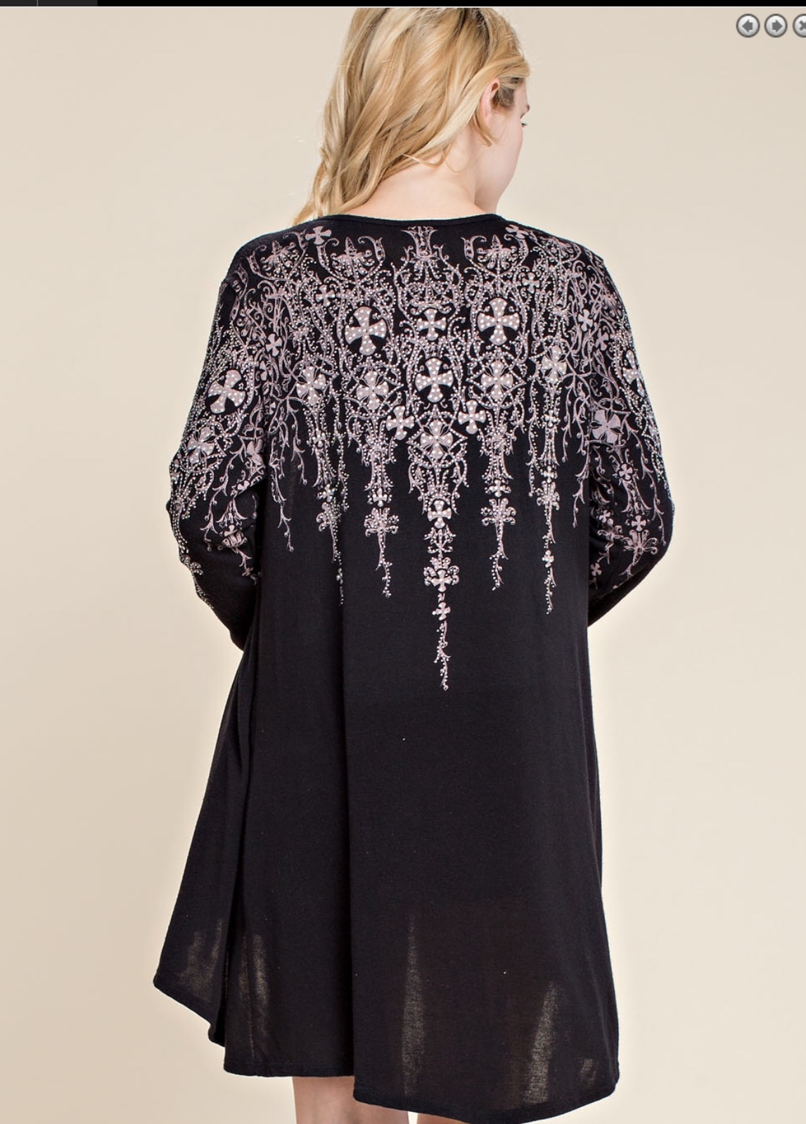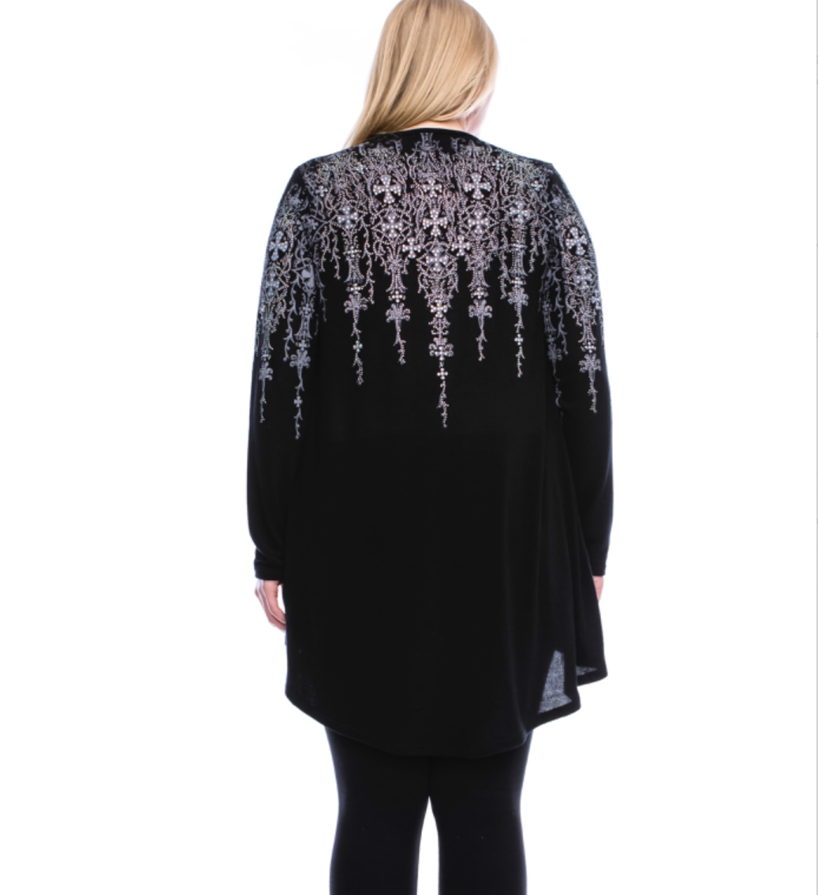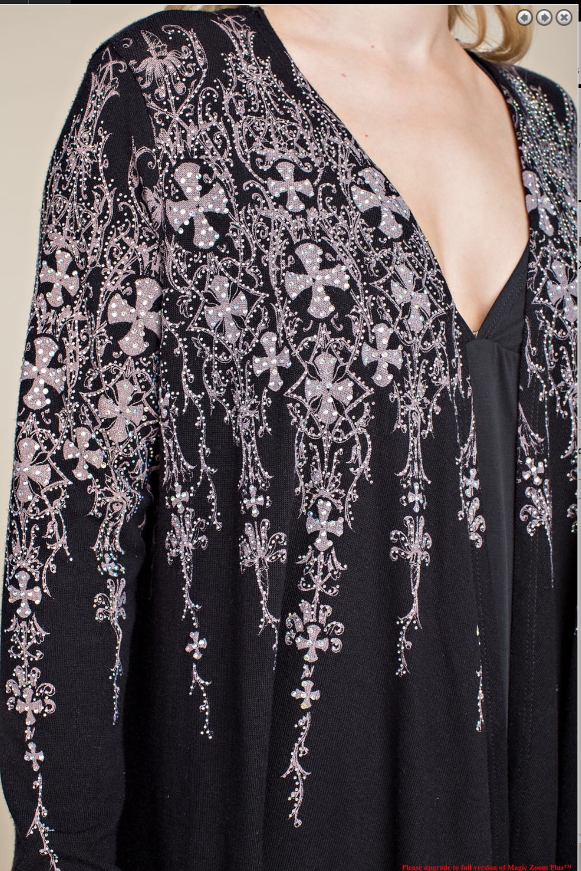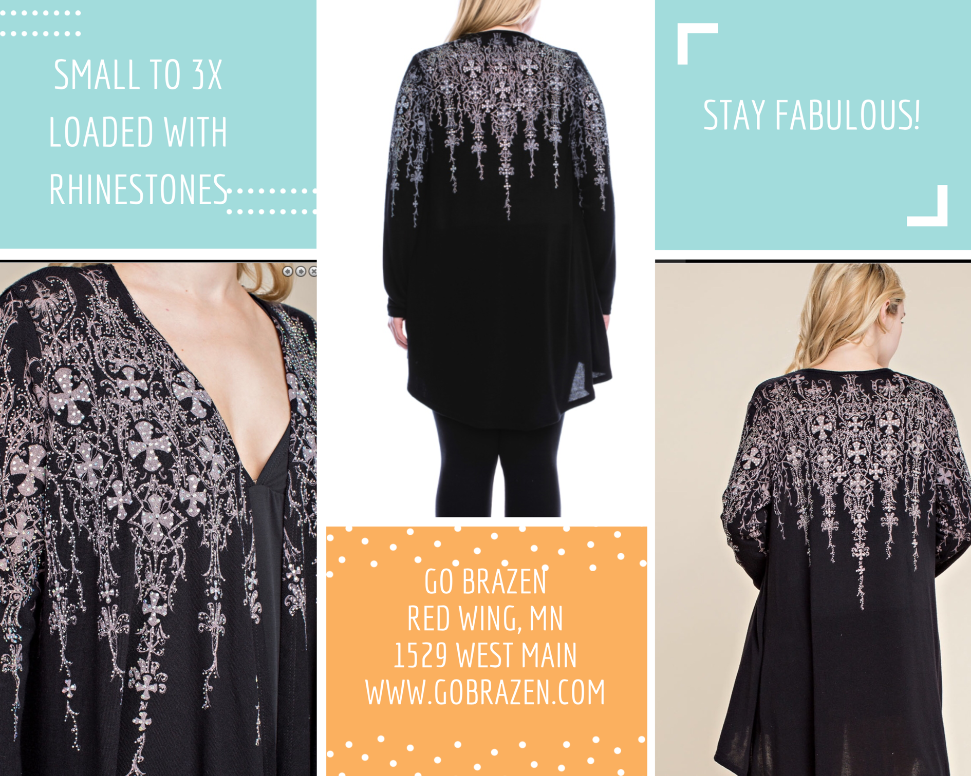 Small to 3x. Sensational glorious sweater! This #cardigan flows beautifully, accenting your body perfectly. This beautiful #sweater is looking added with rhinestones perfectly, for just the right amount of zippity do da!