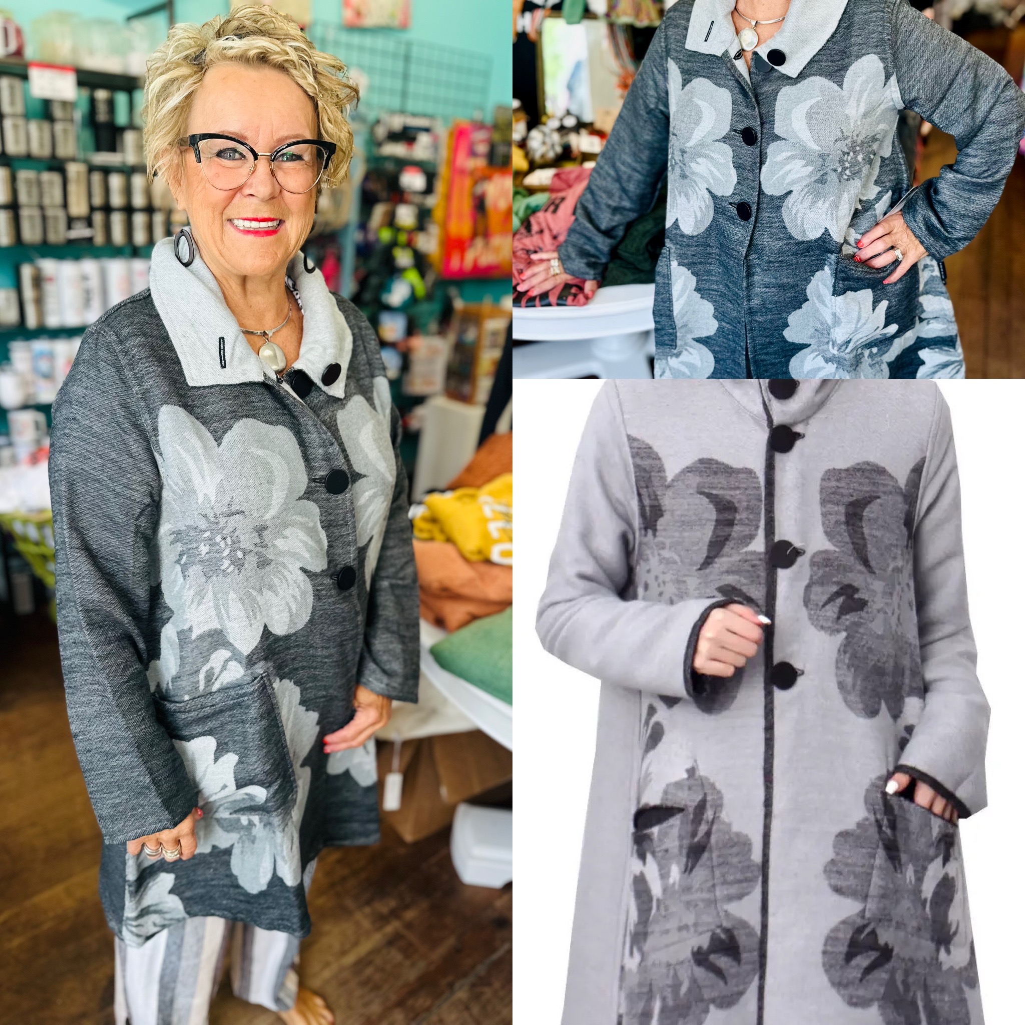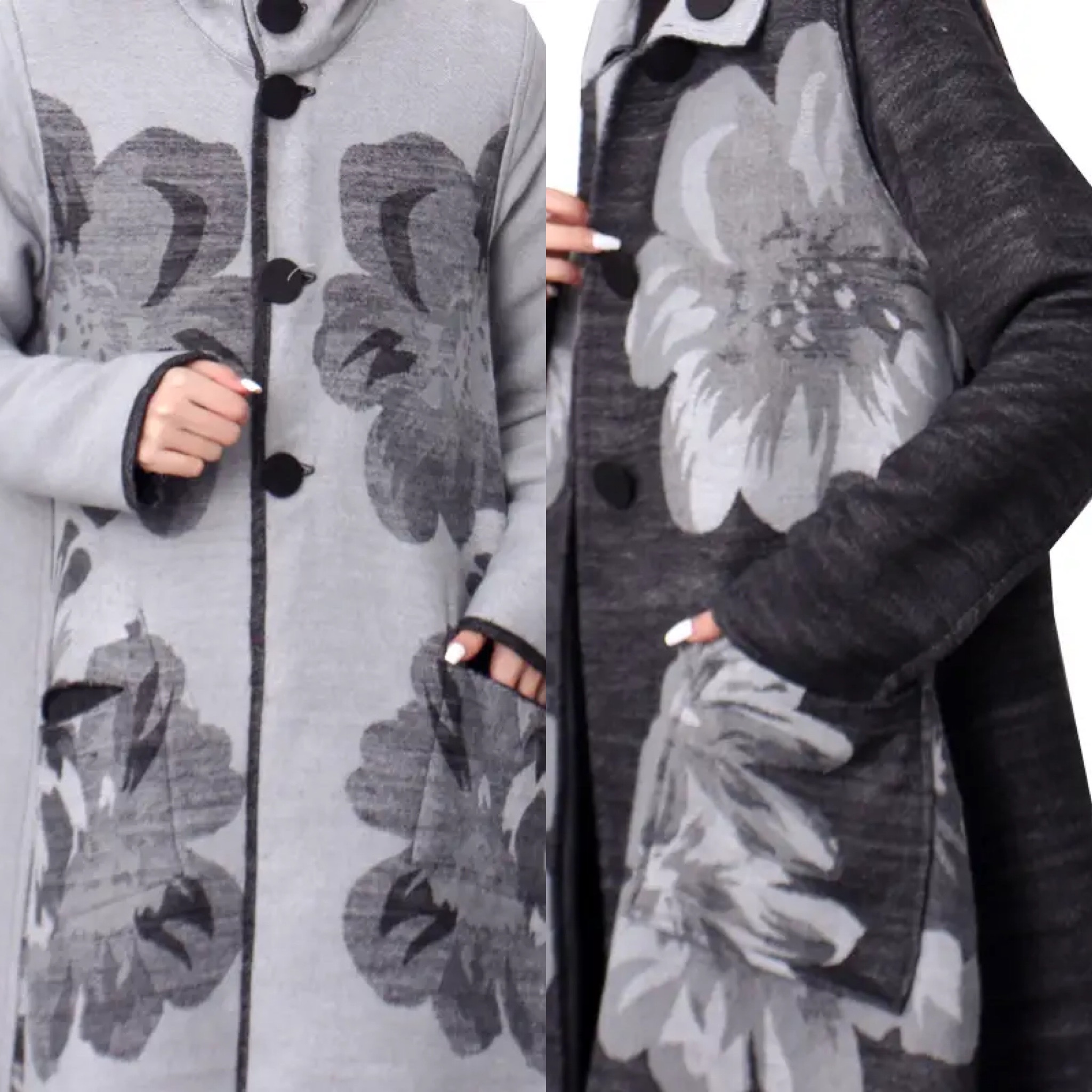 This beautiful sweater coat with floral brocade like pattern has 2 side pockets and is reversible which gives 2 completely different looks in 1 coat. A distinctive layering garment, it is unstructured and has a soft cashmere like feel. Includes 4 large buttons on each side. Has a roll down collar.