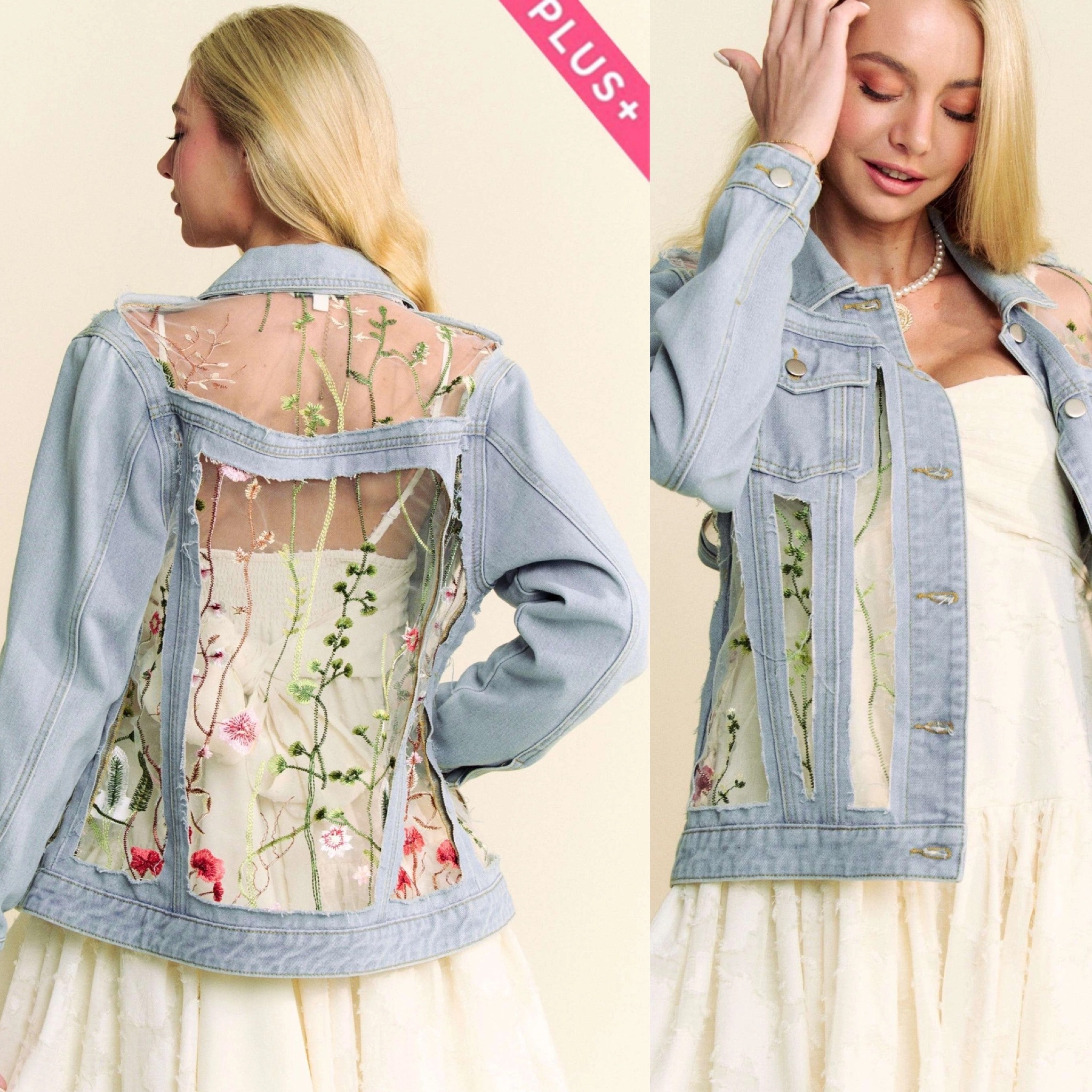 This small to plus size denim jacket, is elevated with sheer floral embroidered panels for a romantic twist on a classic. Designed with button-front closure, flap chest pockets, and tailored structure, it balances casual denim with feminine detail. Perfect for layering over dresses or separates, this versatile boutique piece adds texture and charm, making it a standout addition to any contemporary womenswear collection. 100%COTTON Model is wearing 1X Height: 5'10" Bust : 42C Waist : 38" Hips 45"