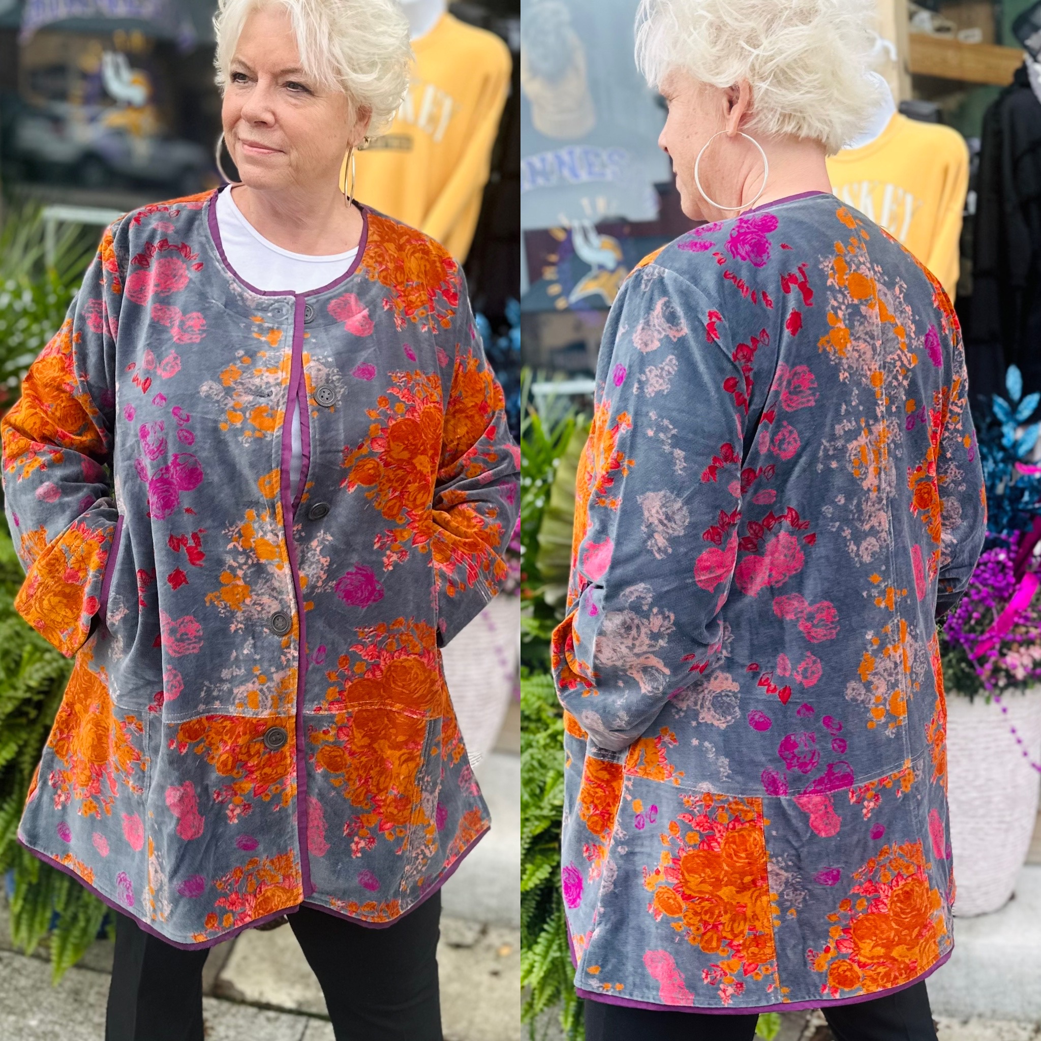 Our soft A-shape silhouette envelopes you in charcoal gray with jewel tone red florals. Cozy and delightfully flattering. Charming details of over stitched seams, pockets and viscose trim finish the look. Fully lined, beautifully finished. Length approx 33". A Little Journeys Chicago Studio print.