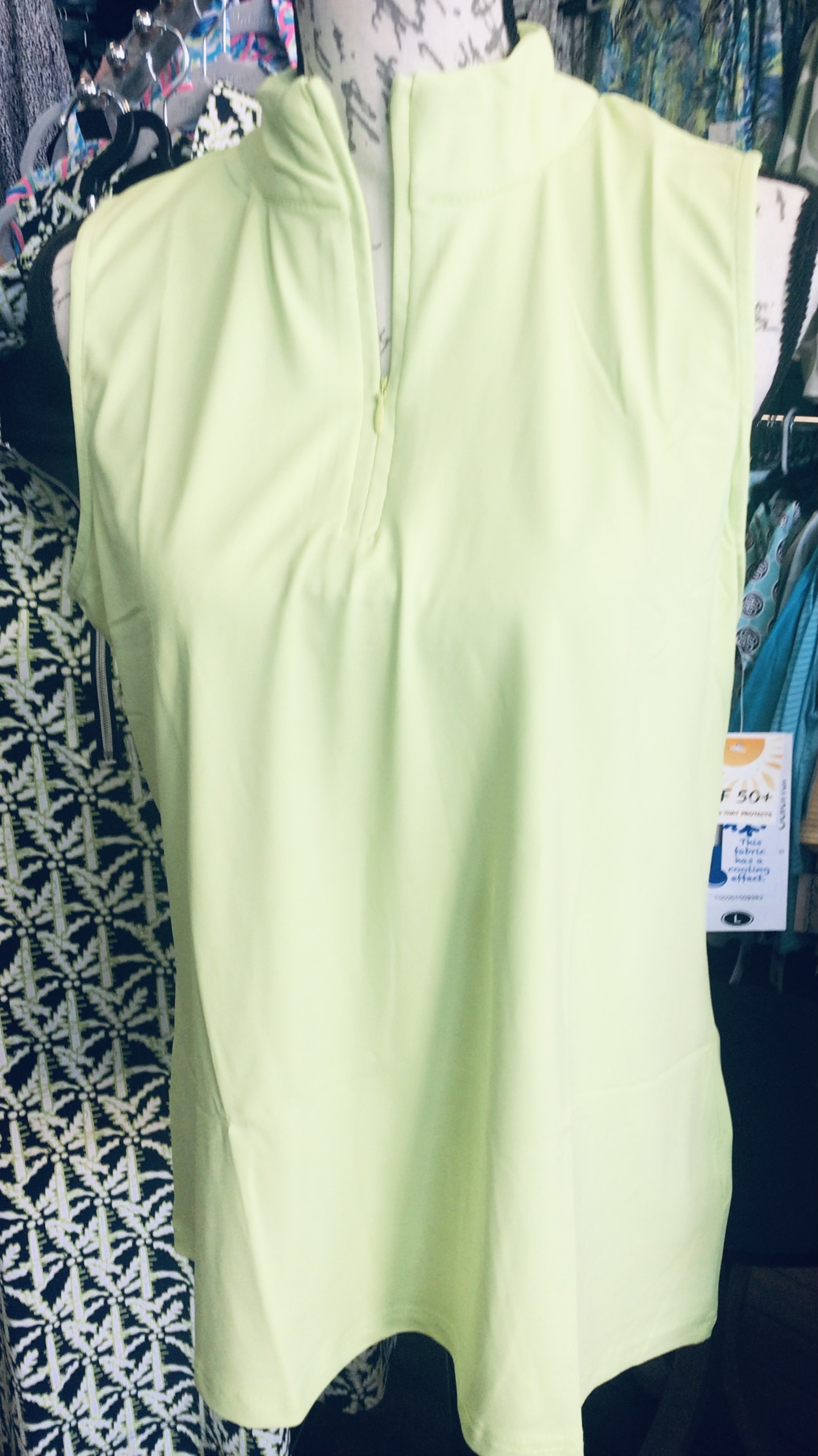 92% Nylon / 8% Spandex, High neck with zipper, Sleeveless, Straight hemline, UPF50+ sun protection fabric, Center back length: 24 inches, Pre-shrunk, Machine wash