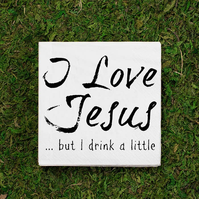 These funny cocktail beverage napkins are 3-ply, measuring 5” x 5” and contain 20 per pack. They are ideal for beverages, hors d’oeuvres, appetizers, or other food items! These humorous, snarky, sassy fun paper napkins make the perfect party conversation piece or hostess gift. Original designs of Twisted Wares are far from primitive. * I Love Jesus But I Drink A Little Religious hostess small paper party top seller *