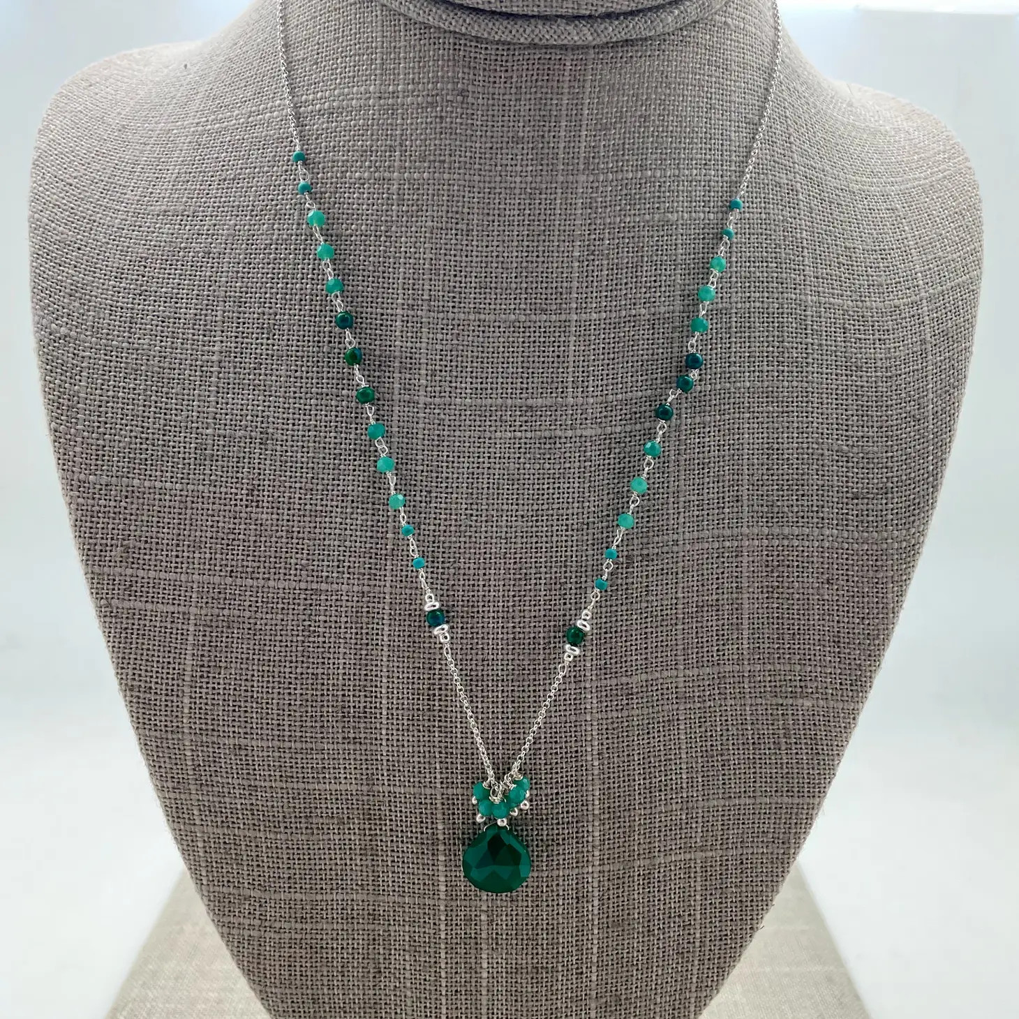 These necklaces are handmade by a women owned artisan group for crossroads. all real components such as semi-precious stones and faceted glass. 16" plus a 3" extender.