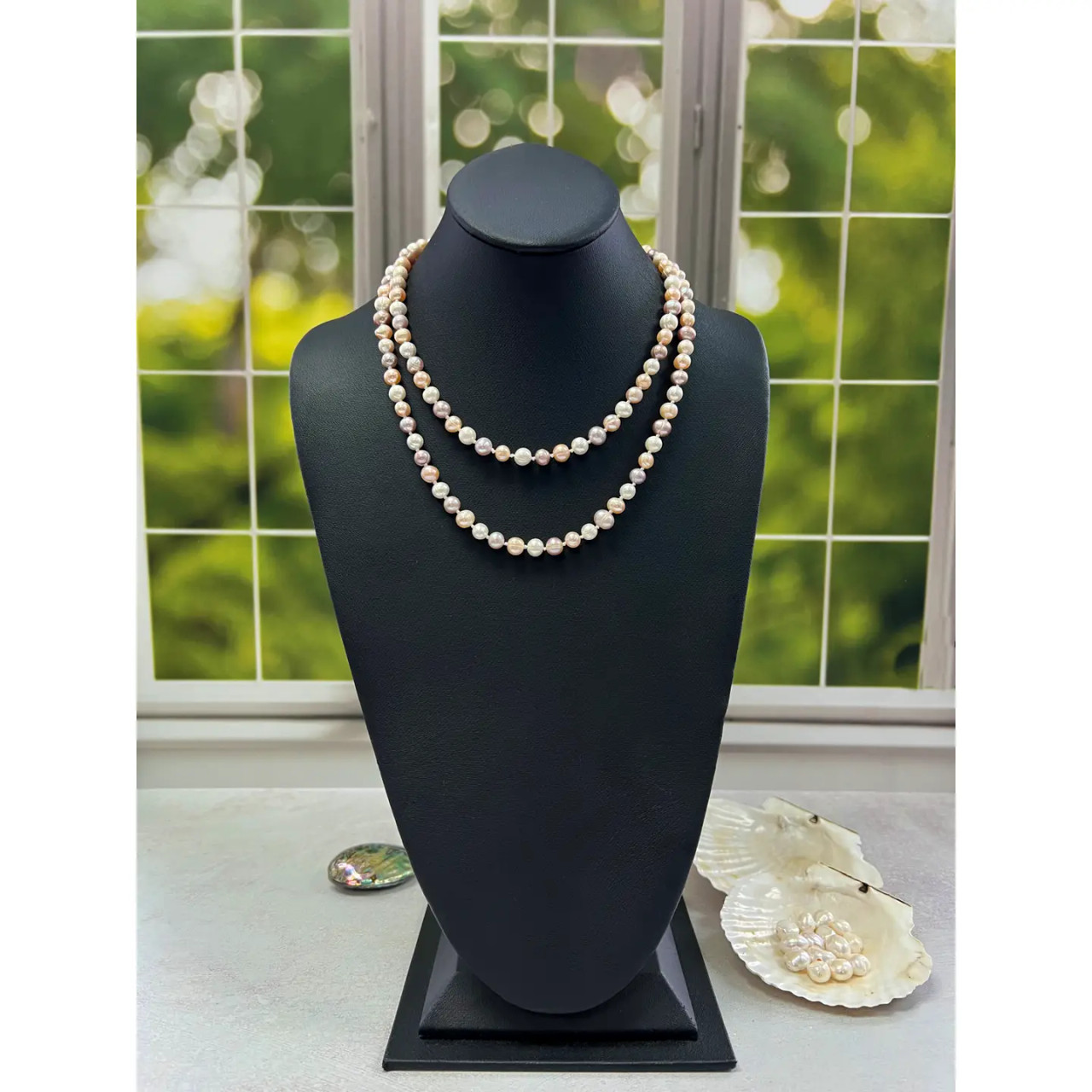 Total Length: 36" L. Major Beads: Freshwater pearls potato-shaped 7-8mm. Colors: Mulicolor. Style: Long-knotted freshwater pearl necklace. Endless infinity-style necklace. Feature: Every pearl is hand knotted with white silk thread.
