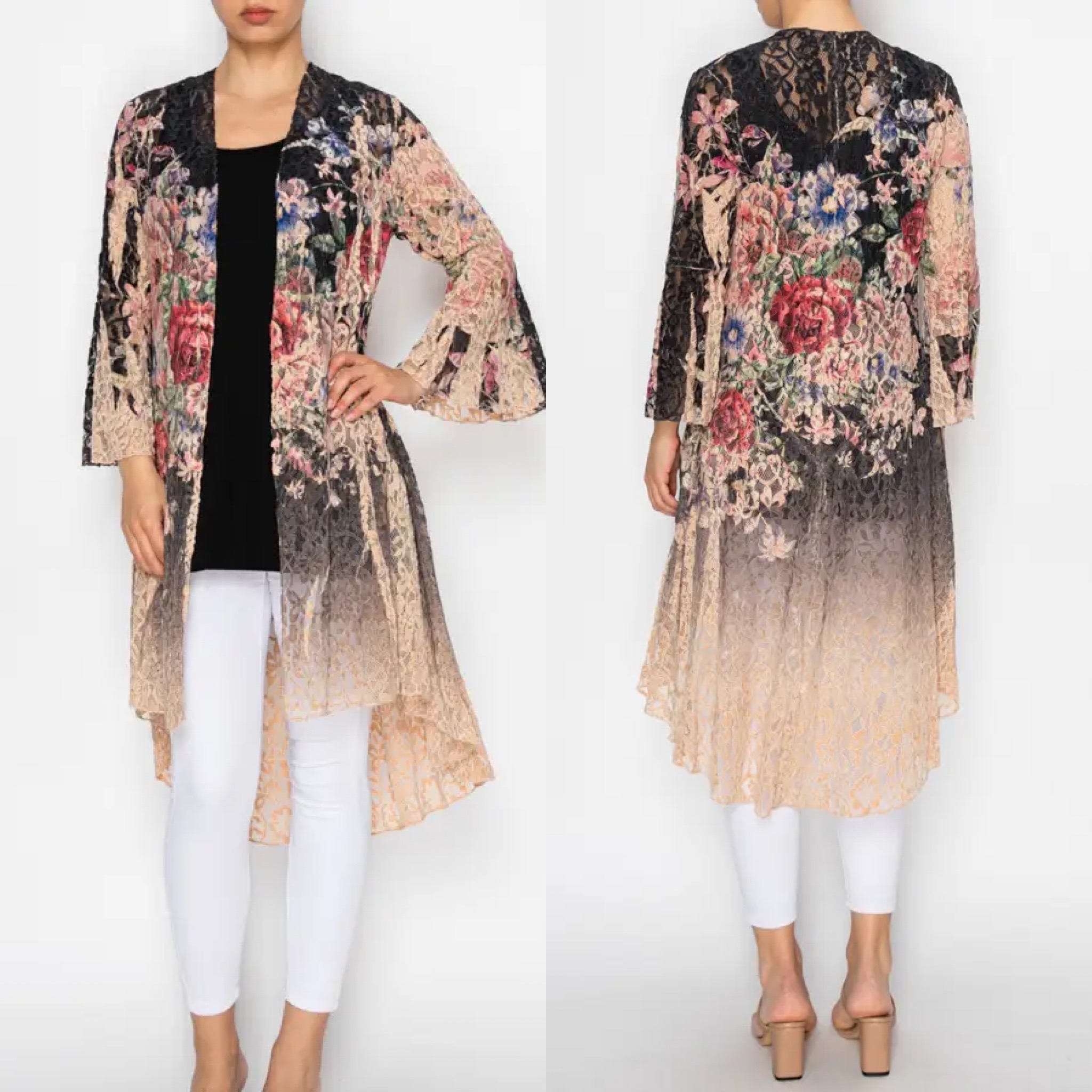 Meet the OLS-4835TP DD BK FL, a long high low lace cardigan from Origami Apparel. This is not just a jacket, it's a fashion piece. Inspired by lace and crochet, this piece is a testament to Origami Apparel's dedication to stylish, on-trend yet classic designs. Crafted for the contemporary woman, this cardigan is a perfect blend of elegance and comfort. Enhance your outerwear collection with this high-low lace cardigan.