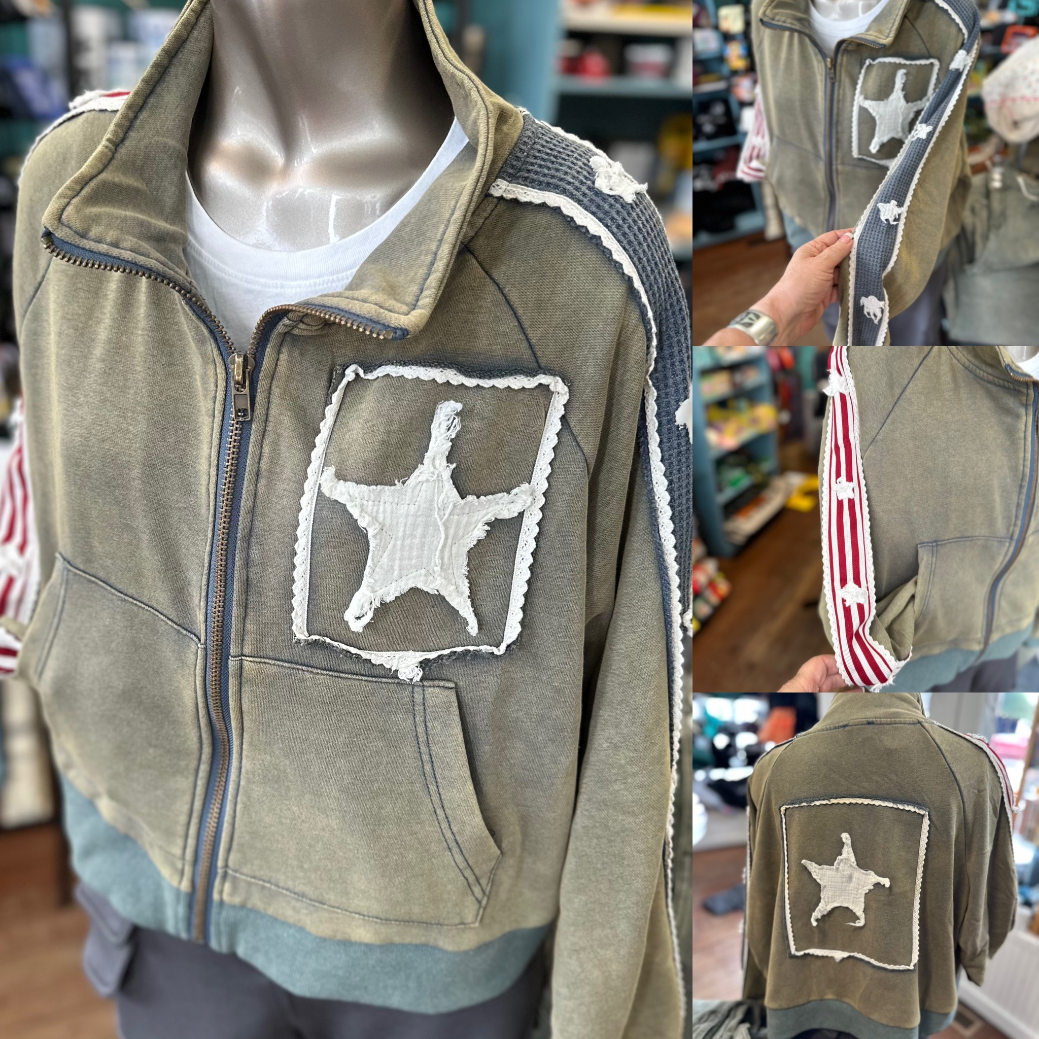 Designed in long sleeve roomy fit jacket in French terry with varied striped elastic and thermal trim tape, lace-bordered accents, and star patch detailing.