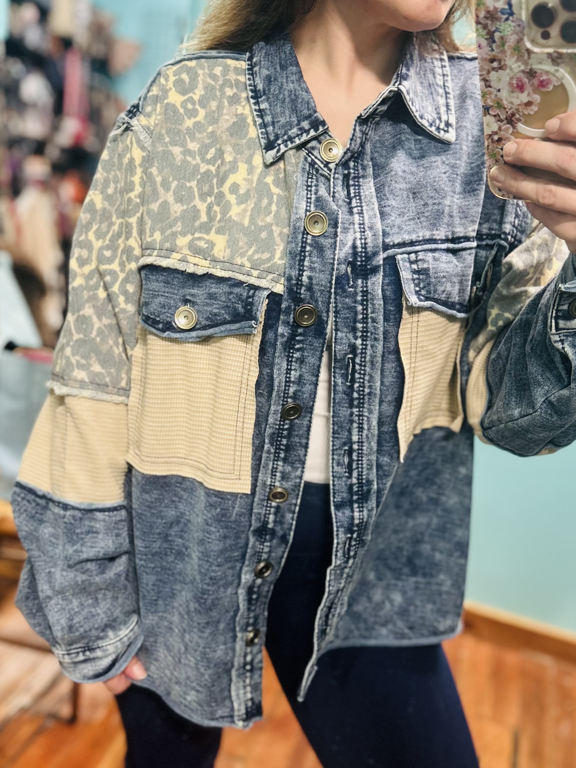 Designed in long sleeve relaxed fit jacket in French terry with animal or floral pattern contrast. Specs/Dimensions: - BUST: 23-1/2" - LENGTH (Front): 24-1/2" - LENGTH (Back): 29" - SLEEVE: 23" - SHOULDER: 18-1/2"