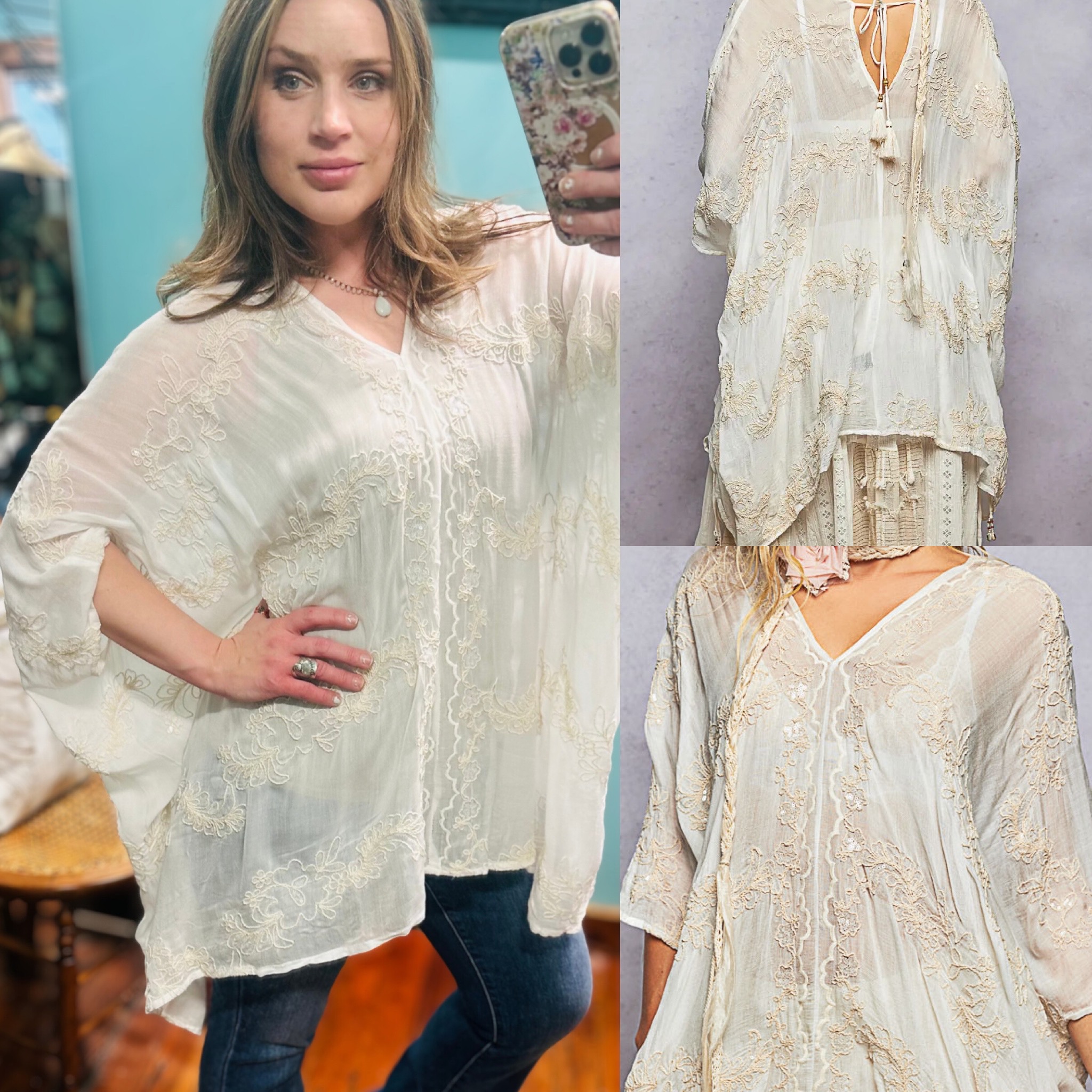 Product Description V-neck cotton kimono top with floral embroidery and back tassel ties 31-inch length and 41-inch bust; 3/4 sleeves Made in India; ships from USA Recyclable packaging; hand wash care