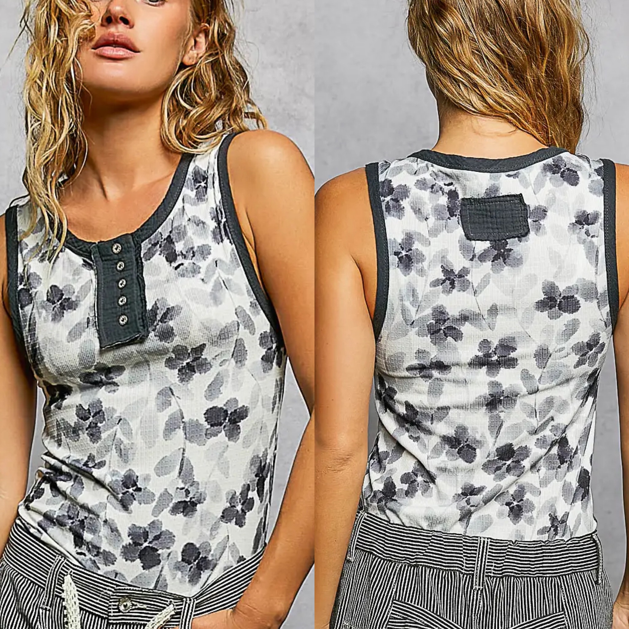 Perfect with our denim jean shorts and one of our denim jean shirts over the top! Designed in round neck relaxed fit sleeveless top in ribbed with floral pattern.