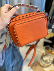 Named one of Oprah's Favorite Things 2021! Inspired by a camera bag, the Kelsey bag can organize everything you need! This structured design and lively colors pair well with both classic and youthful looks. Named after an up-and-coming designer and daughter of team member, Jennifer; Kelsey has always inspired us with her artistic eye. Specific Details Include: 8” vegan leather handle attached, 3” strap drop 47” detachable, adjustable vegan leather strap (color matches bag) One outside zipper compartment Two zippers access main compartment Two RFID protected built-in card slots inside One inside zipper wall pocket Two interior compartments, separated by interior liner Silver hardware Vegan leather Dimensions: 7.5" W x 5.5" H x 3.75" D