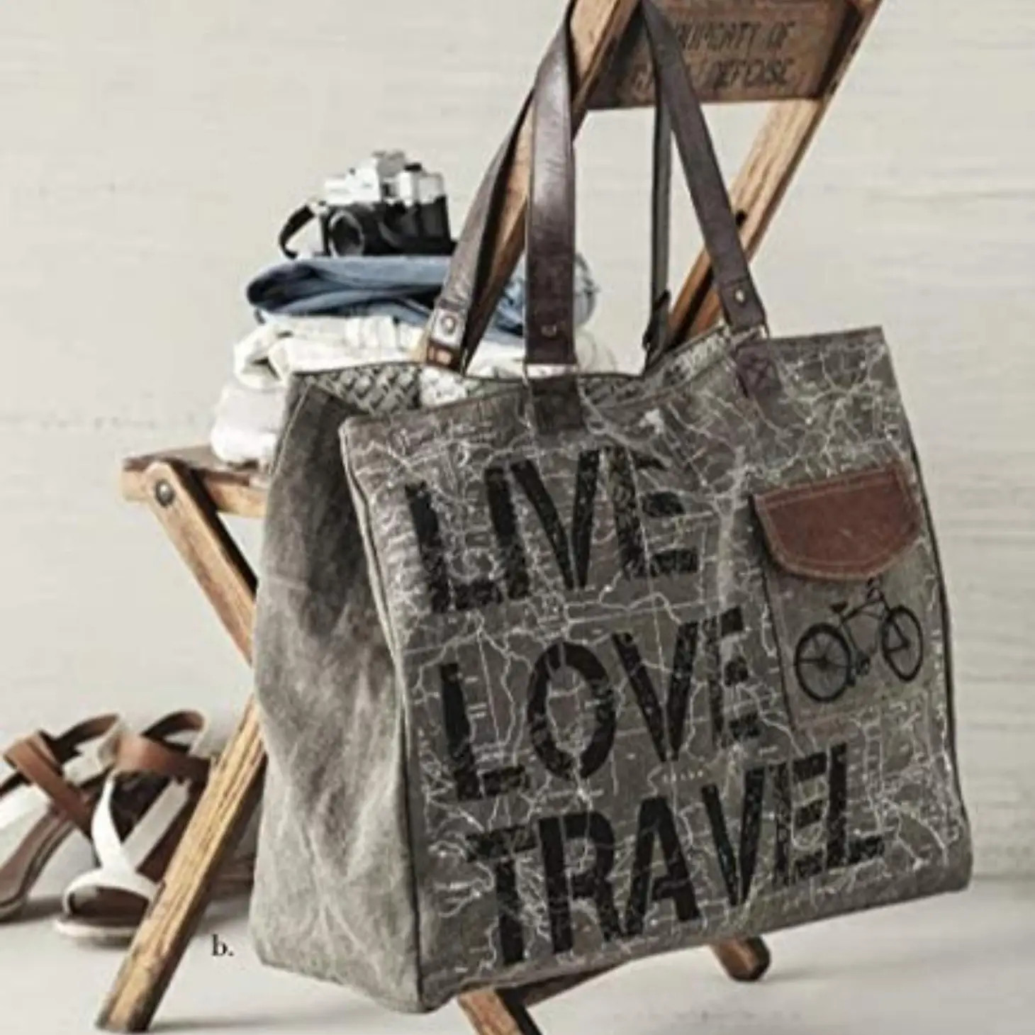 Size: 19" W x 16" H x 8" D Handle: 10" Handle Drop Exterior Features: One Slip Pocket Interior Features: Dual Interior Slip Pockets, Zippered Pocket Closure: Zipper Closure Material: Up-Cycled Canvas Short Description: Command the attention of fellow travelistas and sight-see in style with the Live Love Travel weekender, perfectly equipped for all your adventures. Measures 19" W x 16" H x 8" D, with a 10" handle drop, exterior slip pocket, dual interior slip pockets, zippered pocket, and zipper closure. Made from durable re-milled and up-cycled military tarps & tents used by the army, covering trucks as tarps and providing shelter as tents, this textile is given new life.