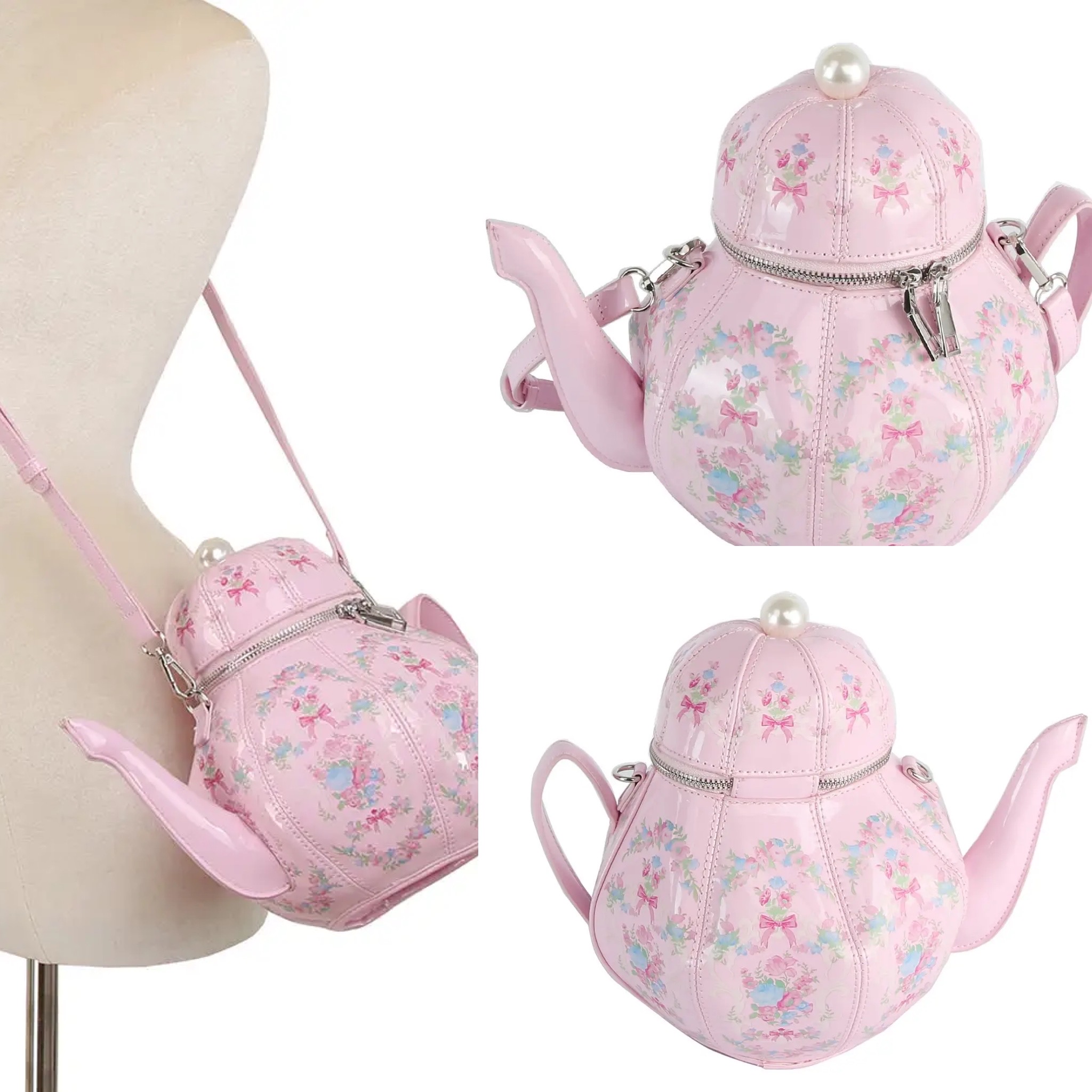 * Shaped like a vintage teapot with floral motifs and pink bows * Glossy patent finish with pearl top detail adds an elegant touch * Double zipper opening reveals as spacious, round interior * Comes with adjustable strap for playful crossbody wear Approximate size: 10 x 8 x 12.5