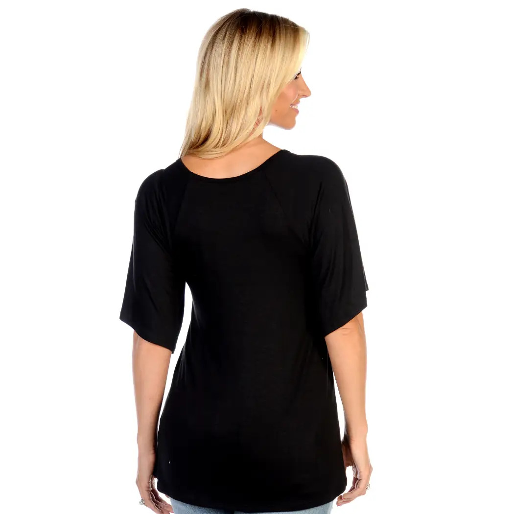 This top features a dolman 1/2 sleeve with a slight bell as well as a triple keyhole neckline with copper foil hanging feathers. Available soon in mocha and blue. MADE IN THE USA , Made in United States.