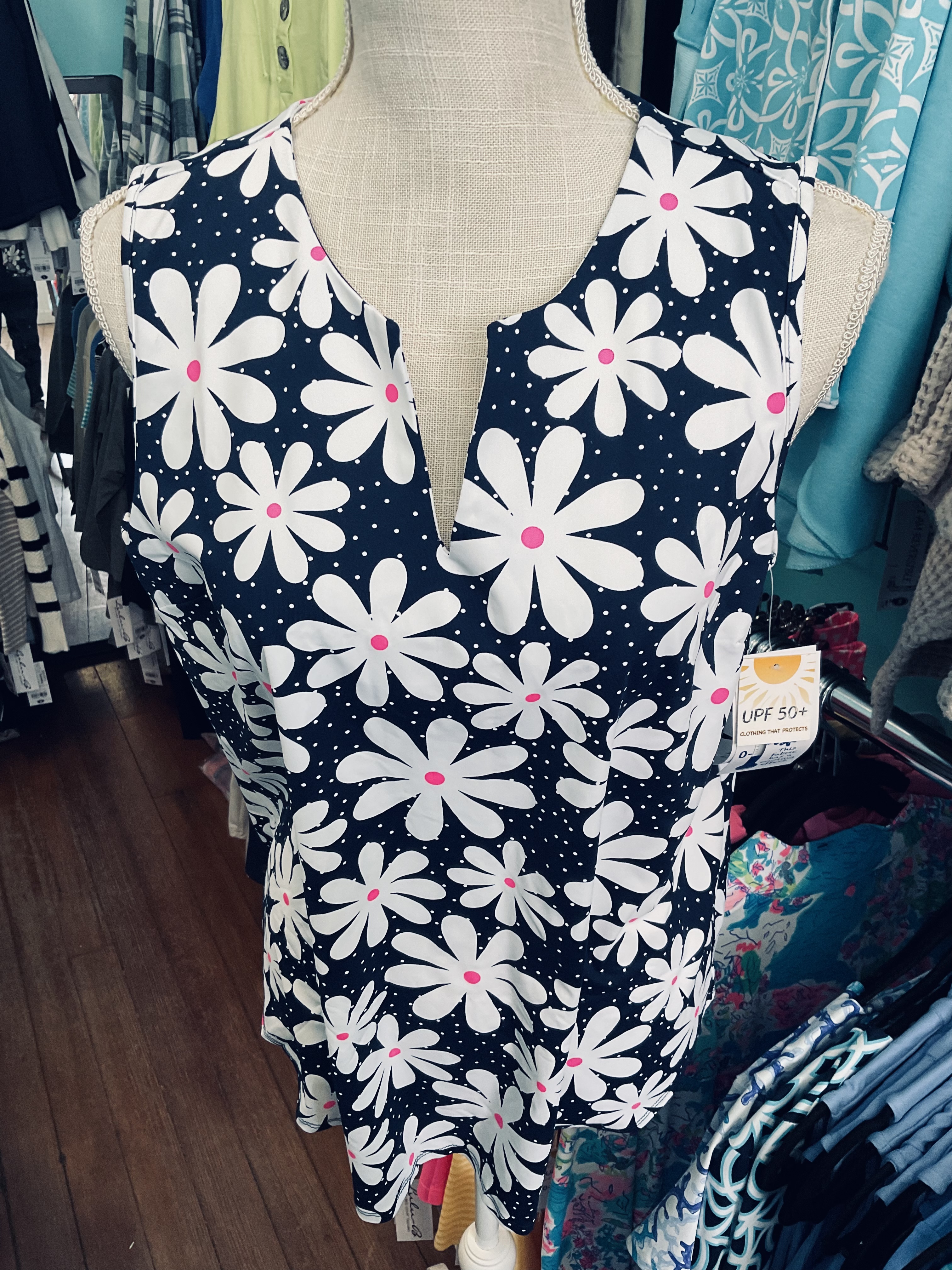 Oh so fun, this #LuLuB top will add so much fun to your boating, lounging, golfing and beaching it! Pair it up with our matching skort and a pair of our new sandapls too. 92% Nylon / 8% Spandex. Zip back pocket, small front pocket. Sewn-in shorts with UPF50+ sun protection fabric. Length 17 inches. Pre-shrunk