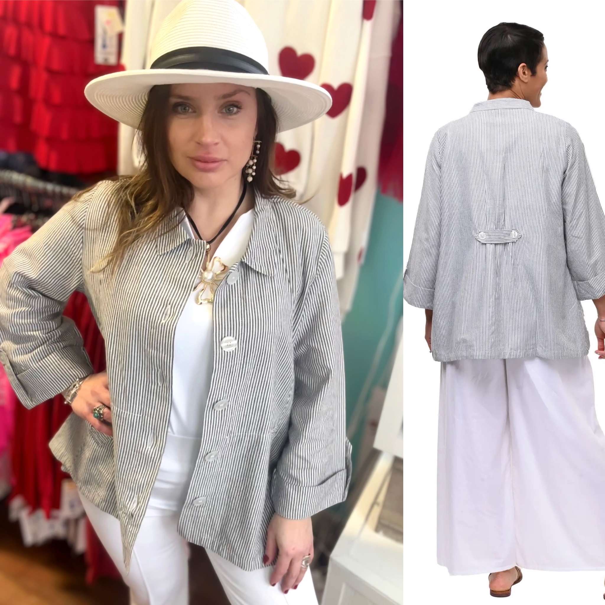 New from Tulip, A-line button-front jacket in a ticking stripe pattern. Check out the matching Capri pants too.